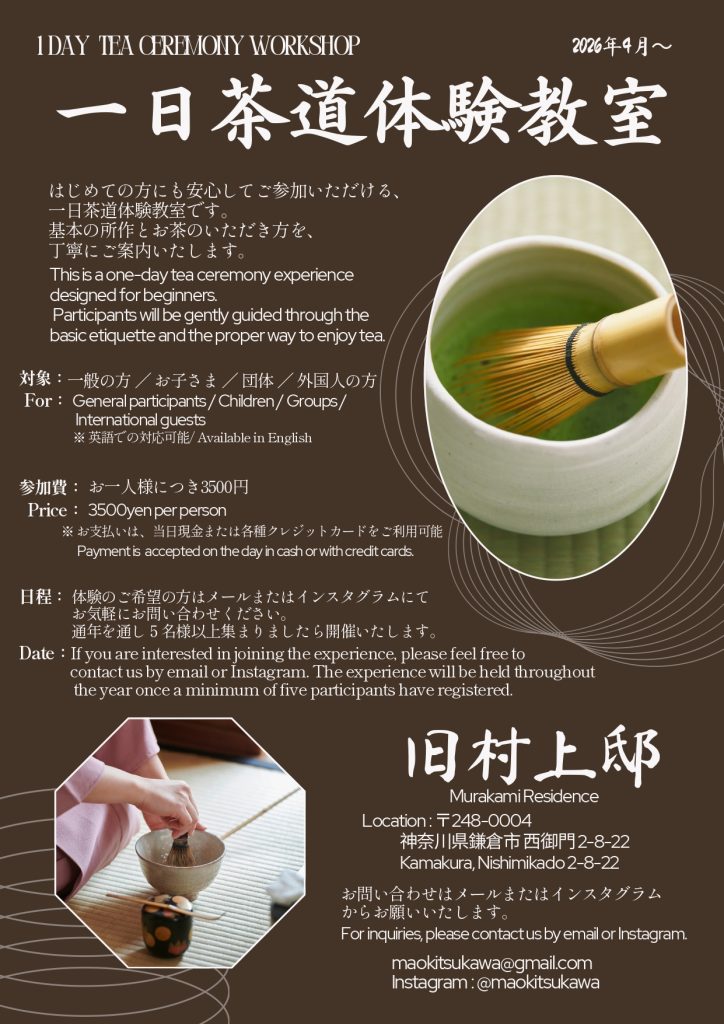 2026年4月より、旧村上邸にある茶室にて、1日茶道体験教室の開催が始まります。